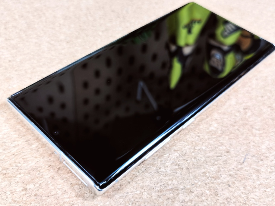 กระจกจะมีลักษณะเรียบๆ ใสทั้งแผ่น ไม่มีขอบสีมาบังจอ จะเล็กกว่าหน้าจอในบางรุ่น แต่ข้อดีคือใส่เคส (Case) ได้หมดทุกรูปแบบ