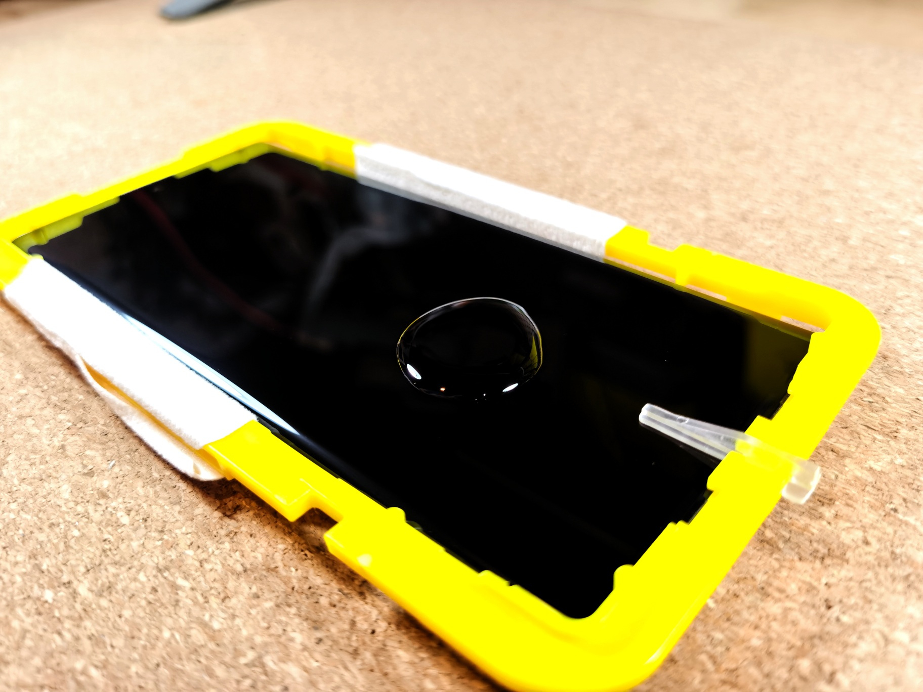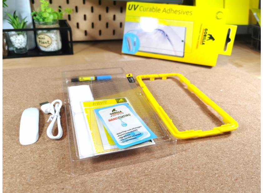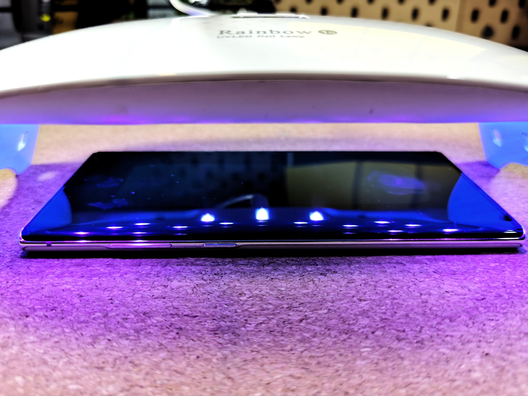 และเมื่อฉายแสงอัลตราไวโอเลตก็จะแห้ยึดติดฟิล์มกระจกกับหน้าจอมือถือได้ อีกทั้งยังทำให้การสัมผัส ทัชสกรีนไม่ผิดเพี้ยน และได้ฟิล์มกระจกโค้งที่ใสทั้งแผ่นไม่มีขอบสีบดบังหน้าจอ